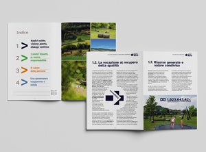 Lo sviluppo del design ha tenuto presente anche della sostenibilità del documento, limitando le campiture di colore piene ed estese, che comportano spreco di toner per le stampe ”interne”, e non facilitano la lettura. Infine la sfida è stata quella di ottenere un design interessante ma che impatti poco sul “peso” del pdf per un download più veloce.